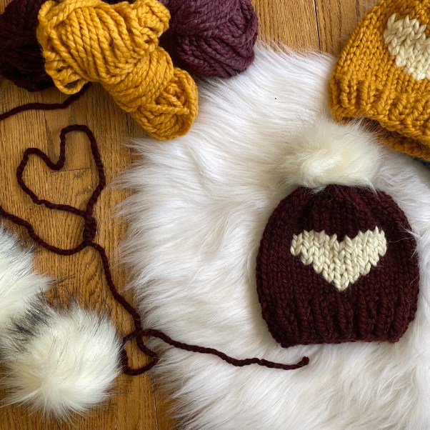 Hats you will LOVE for all ages! This adorable heart print hat paired with a fluffy white faux fur pom is a serious mood-lifter during even the stormiest of forecasts. It’s super soft, ultra warm and comes in four colours: Denim, Fig,Claret and Mustard. Sizes available for mom and the entire gang! Handmade with tender loving care and high quality yarn (80% Acrylic, 20% Wool Blend) by the fastest knitter I know, Natalie of Knits by Nat.